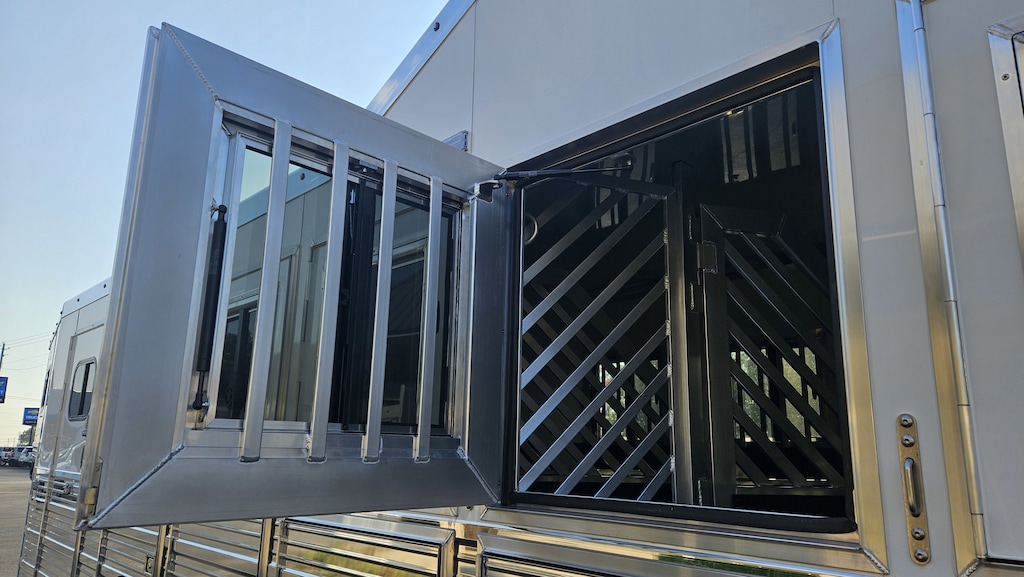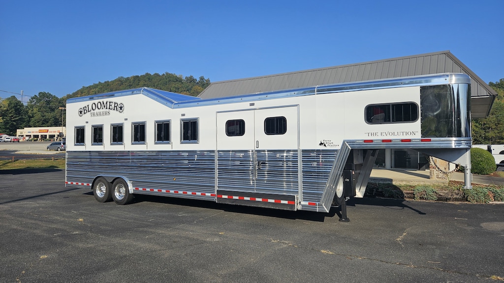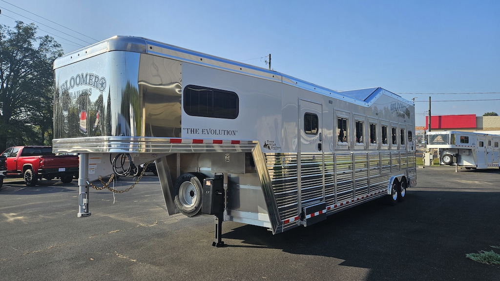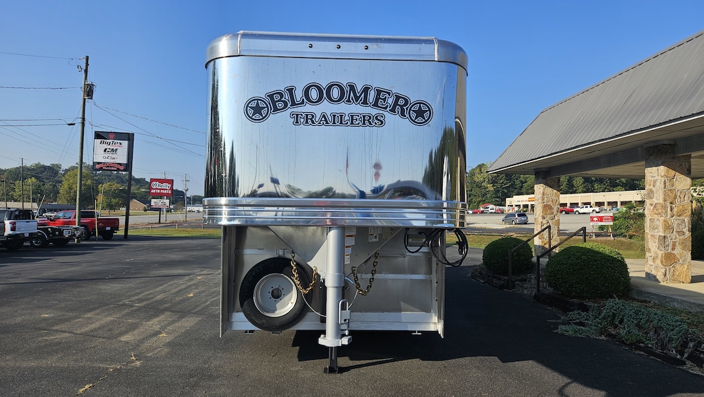 Brand new 2026 Bloomer 6 Horse trainer trailer, drop doors on head and tail with shocks on feed doors, managers, integrated hay pod, stud wall, 17.5in Alcoa wheels with two 8k lb axles, broom closet in rear, ramp, huge double door side tack with shocks on blanket bars, front dressing room with boot box, keyless deadbolts, hydraulic jack, electric over hydraulic brakes. 8 wide 7'6 tall.