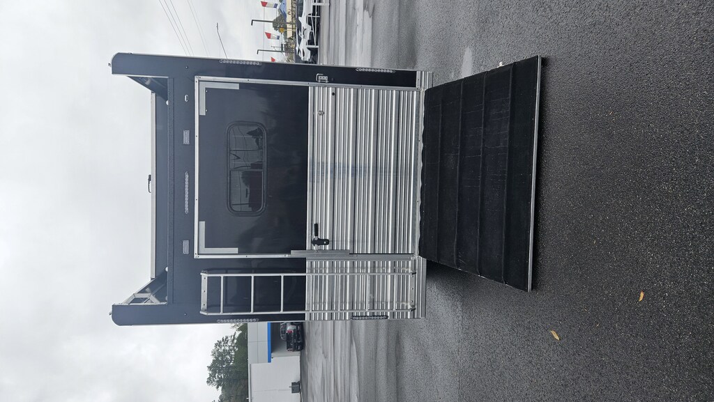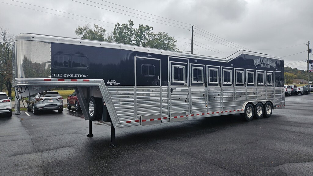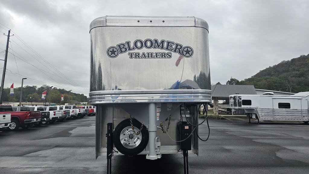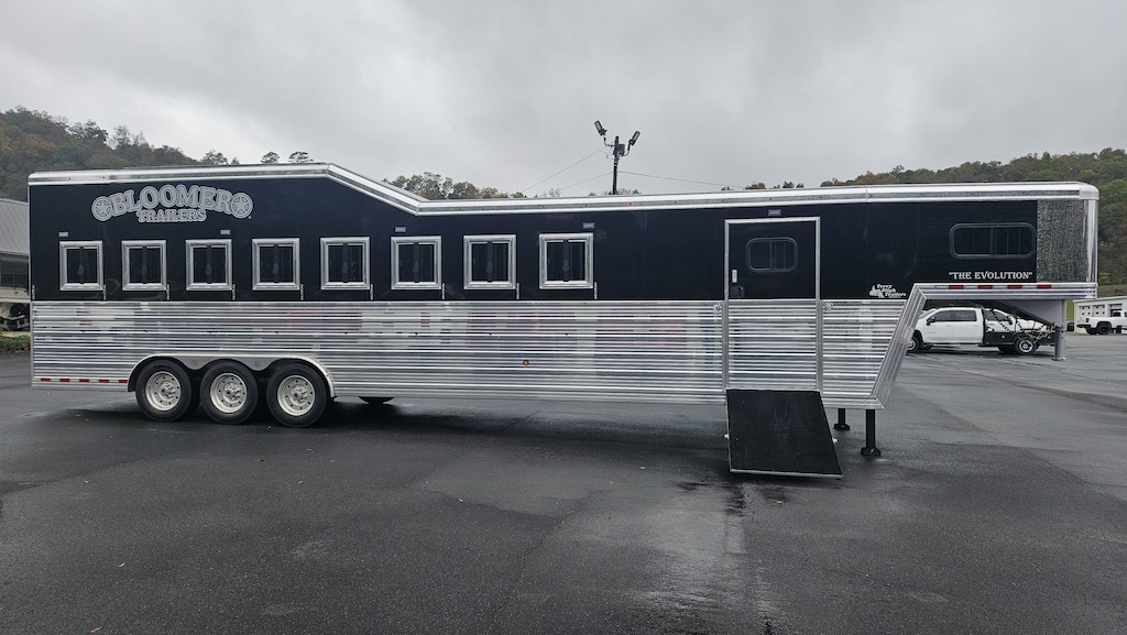Brand new 2026 Bloomer 8 Horse Trainer trailer, this trailer has drop doors on head and tail with shocks on feed doors, broom closest on rear, ramp, 2 stud walls, mangers, escape door, hydraulic jacks, electric over hydraulic brakes, 3 8k lbs axles with 19.5in Alcoa wheels, 8' wide, 7'6 tall, keyless entry, huge pass thru tack room/dressing room with passenger-side ramp, boot box